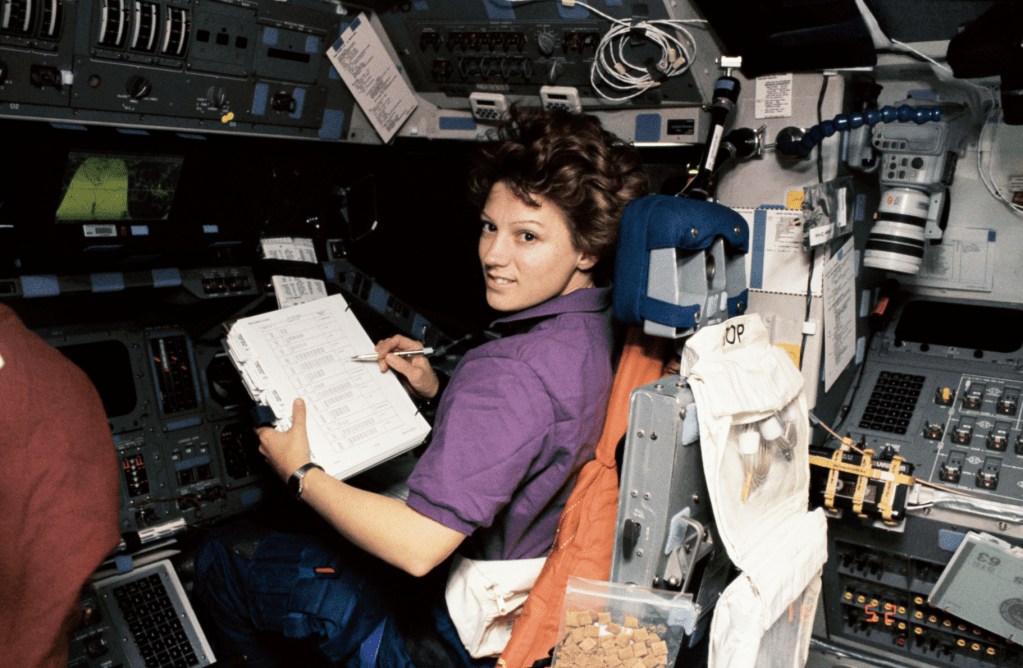 Feb. 3, 1995, Astronaut Eileen Collins at the Pilot’s Station on Shuttle Discovery via https://www.nasa.gov/mission_pages/shuttle/imagesNASA astronauts Doug Hurley (foreground) and Bob Behnken (background) participate in a two-day flight simulation. The astronauts are inside a SpaceX flight simulator in this photo. Credit: SpaceX